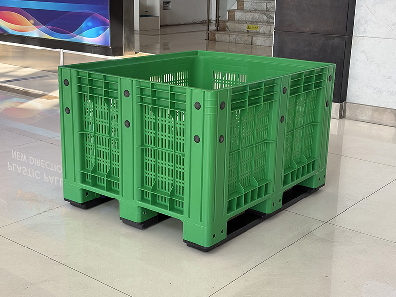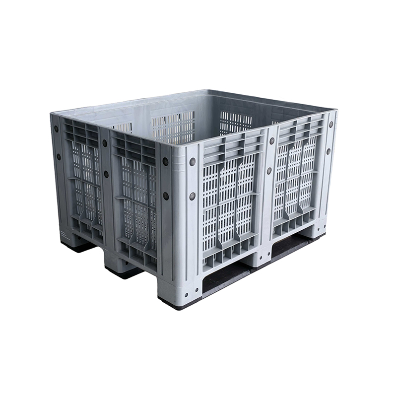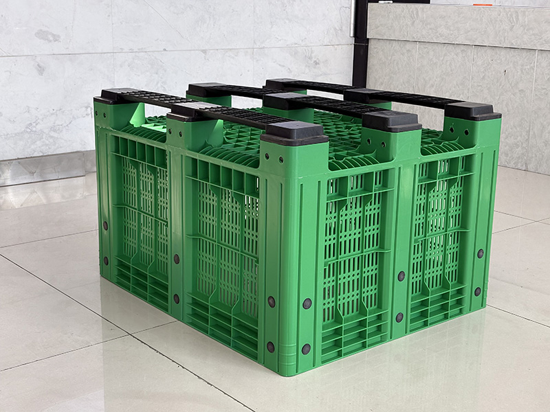 The reinforced structure with ventilated side panels ensures both high load capacity and proper airflow, making it ideal for storing and transporting fruits, vegetables, seafood, and industrial parts. The integrated pallet base allows easy handling with forklifts and pallet jacks, improving operational efficiency in warehouses and logistics systems.